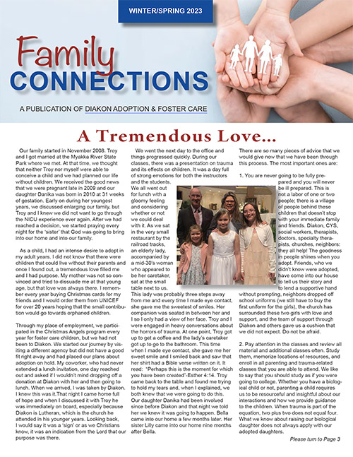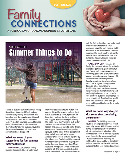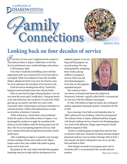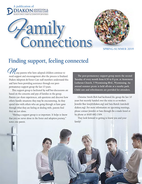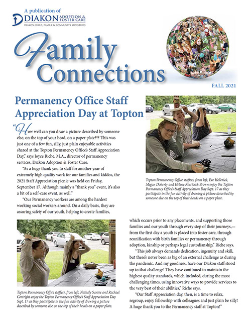 Read Diakon Adoption & Foster Care's Family Connections newsletter, which includes announcements of placements, finalization reports, staff updates, general adoption news, as well as heart-warming stories about uniting children with foster and adoptive families.